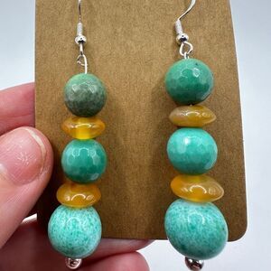 2.5" long faceted green moss, yellow jade, and ceramic beaded dangle earrings!