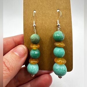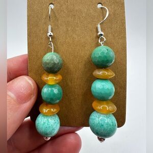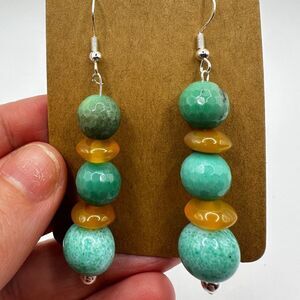 So these are 2.5" long and have faceted dyed green moss agate beads, in addition to yellow jade disc-like beads.