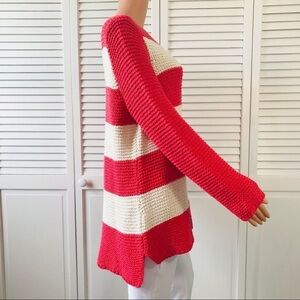 Details: Chico’s coral and ivory striped sparkly knit scoop neck sweater with vents on the hem.