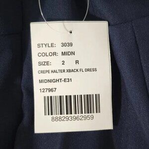Dessy Collection dress, midnight crepe gown, halter x-back dress, size 2R formal dress, elegant evening gown, bridesmaid dress, navy blue formal dress, sleek halter dress, special occasion gown, wedding guest dress, floor-length dress, timeless evening wear, sophisticated formal attire, chic x-back gown, stylish crepe fabric dress