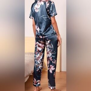 Experience luxurious comfort with this floral satin pajama set. The elegant navy blue and pink design offers a stylish touch to your sleepwear collection.