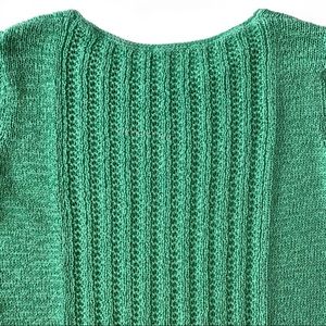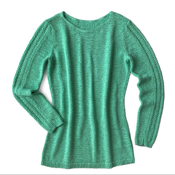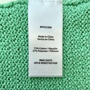 Gorgeous light green openwork crochet sweater top! Super comfy, good stretch & has ribbed banding trims on hem and cuffs. Slightly translucent through knit but not so much that I would not ware it to casual office with a skin-tone bra. 73% cotton, 27% polyester. Machine wash cold.