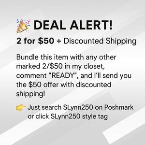 Bundle this item with any other marked 2/$50 in my closet, comment "READY", and Iโll send you the $50 offer with discounted shipping!