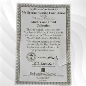 Celebrate the beauty of motherhood with My Special Blessings From Above, a heartfelt figurine from the 2007 Thomas Kinkade Mother and Child Collection by The Hamilton Collection. Figurine #0422A features exquisite detailing and tender emotion, capturing the timeless bond between mother and child.