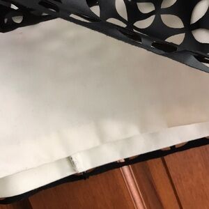 Skirt is of black vegan leather laser cut which shows the white skirt through