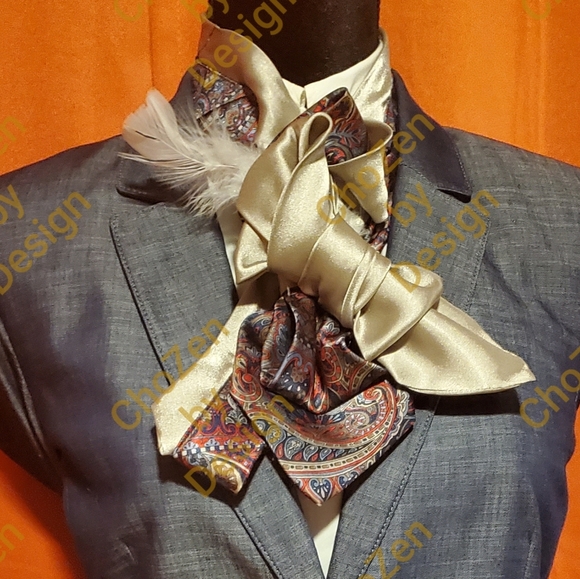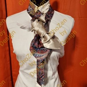 "Designed with You in Mind"...This escarpe which I have dubbed "Chassidy" is a unique piece of art to add an extra flair to your regal attire. This upscaled necktie scarf is handcrafted accentuated with paisley and beige print which exudes an elegant enhancement.