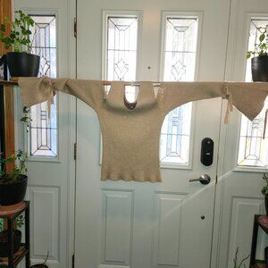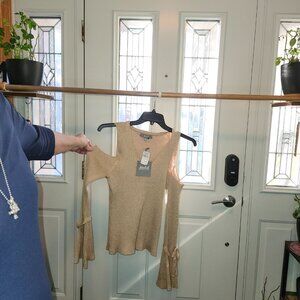 25041. NWT!! MARLED Cold Shoulder Pullover Sweater Gold Sz L features ribbed lightweight sweater with long belle sleeve with ties. Brand new with Nieman Marcus tags still attached. MSRP $79 sold for $55 at Nieman Marcus. In a size Large. In latte with gold thread. Shimmery fabric for glam!