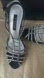 Black Satin with Embellishments Throughout. Open Toe Ankle strapped heels. Has a bit of a platform