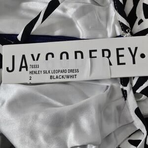 Jay Godfrey dress, black and white leopard dress, silk henley dress, size 2 mini dress, chic animal print dress, stylish cocktail dress, trendy night-out dress, elegant silk fashion, statement mini dress, fashionable party dress, sophisticated evening wear, modern designer dress, bold leopard print dress, sleek fitted dress, luxury fashion piece