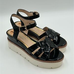 Chic and stylish Primadonna Collection wedge sandals in black patent leather with a platform sole. These strappy ankle-strap sandals are lightweight and modern—perfect for spring and summer looks. Italian-made quality with a bold, comfortable silhouette.
