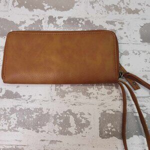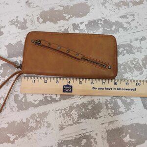 Keep your money and cards organized with this stylish wallet that comes with a spacious compartment and a faux zipper pocket. Made in India with durable leather material, this wallet is perfect for everyday use. With a solid pattern and a chic faux zipper pocket on the front, this wristlet wallet is a must-have. Add it to your collection and carry it with you on the go.