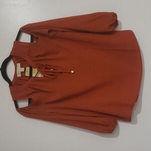 This beautiful rust orange Michael Michael Kors blouse features stylish cold-shoulder cutouts, a keyhole neckline with a tie front, and elegant gold-tone accents. The relaxed fit and lightweight fabric make it perfect for work, dinner, or a polished casual look.