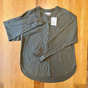 The olive tone makes it incredibly versatile—it’s one of those colors that works in every season and pairs with denim, black, or lighter neutrals. The half-button placket and relaxed fit keep it easygoing, but the details (like the cuffed sleeves and curved hem) make it look intentional.