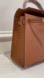 Modern and classic design handbag. Crafted in Genuine Epsom Leather in Golden Brown with contrast stitching. Rolled top handle, flap closure, two front straps with center closure. Clochette, lock and one key included with gold detailed hardware.