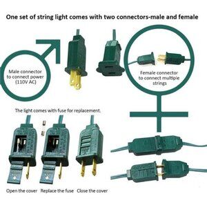 🧿Energy-efficient 5W bulbs, E12 candelabra base, 125W per string | 110V Power | Comes with Spare Fuse | UL Listed for general indoor/outdoor applications. Bulbs can be replaced by any Candelabra (E12) ones that single bulb not exceed 7W. Connects up to maximum 3 strands, total strand load that powered by one outlet can't exceed 432W