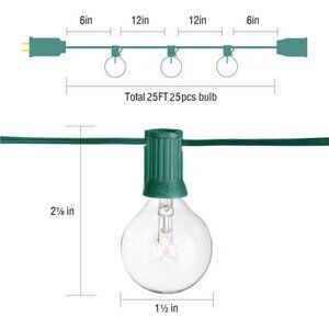 🧿G40 globe string lights are made of 25 feet long string used to connect 25 clear G40 Bulbs. 6” lead with male plug, 12” spacing between bulbs, 6” tail with female connector. Each strand has end to end connections, so that you will easily be able to attach up to 3 strands to cover large areas. Even with broken or removed bulbs, remaining bulbs will continue to light up