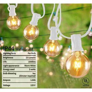 🧿💡 Characteristic: 5 watts each glass bulb, 120 Voltage, 125W per string. 25 feet globe string lights with 25 clear globe Edison incandescent bulbs(plus 2 spare bulbs) on a white cord. G40 Plug in hanging light string bulbs have E12 candelabra socket screw base, UL listed for indoor & outdoor use.
