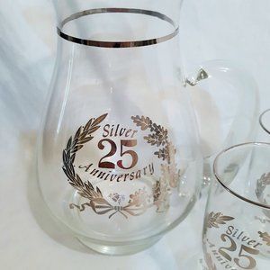 Vintage West Virginia glass HAND MADE - 5 glasses - should have been 6 ... otherwise everything is perfect. It's glass trimmed with silver - real silver. Heavyweight. Pitcher weighs 2.7 pounds - unpackaged. Even have the original box (in not great condition)