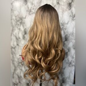 Trendy, fashionable, and comfortable blonde to brown color long wavy wig. Made with heat resistant fiber. Can be styled with a curling iron or straight iron under 150F.