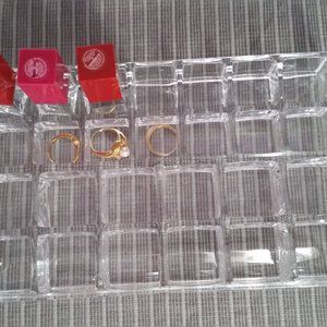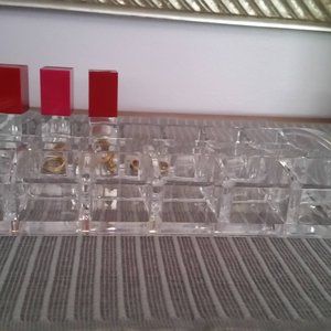 26 Compartment Jewelry/Makeup Storage Tray. Clear Heavy Acrylic 8 5/8" W x 5" D x 1" H. 26 spaces total. Twelve spaces @ 1.5" x 1.25" and fourteen spaces @1"x1". This tray is made of high quality heavy duty acrylic, not lightweight plastic. Excellent condition. Note: lipsticks and jewelry are for photo purposes only and are not included. (much nicer than many styles made of lighter weight plastic). Great for storing small items- beads, earrings, rings, nail polish or lipstick tubes. Never used. No tags. It can also be used as a tray inside of a larger box or drawer.
