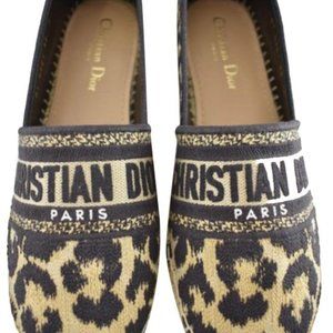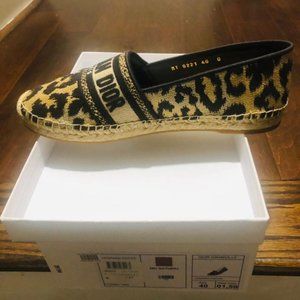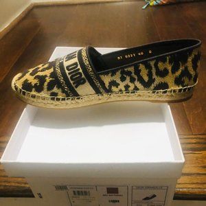 The Dior Granville espadrille has a leopard spots print motif. Crafted in black and beige embroidered cotton, it is embellished with hallmark House details like the 'Christian Dior' signature on the upper. The shoe has a rope sole made in a traditional manner. Rope around the sole, thin rubber sole with star, Dior's lucky symbol. It is made in Italy.
