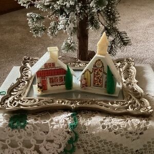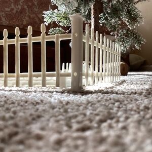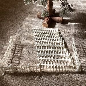 13 interlocking white picket fence sections. 3 cardboard village structures. 3 plastic structures. 3 plastic trees. 2 bristle brush trees. Bulb hanger box with a few hangers inside. Small angel. It’s all in good condition.