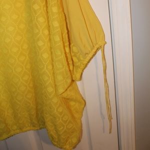 26/28 Lane Bryant Yellow Scoop Neck Blouse with Geometric Pattern. This blouse has ties at each arm to tie in a pretty bow. The blouse also has banded elastic at the bottom and around cuff of sleeves (where the ties come out) to adjust as needed. This gently used dressy blouse has still got a lot of life in it and would pair perfectly with a cami underneath.