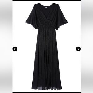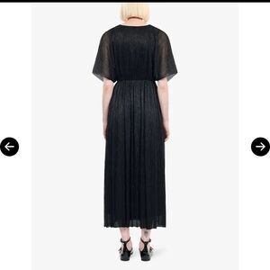The Kooples maxi dress is crafted from a woven fabric with metallic fibers. It features a V-neckline, short butterfly sleeves, and an elasticated waist. The dress is semi-sheer and has a flared hem. It is lined and dry clean only. This dress has a regular fit and is true to size.
