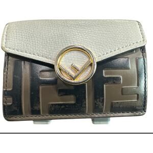 This authentic Fendi Vitello Soft Catalan Mirror F is Fendi Bi-Color Embossed Micro Tri-Fold Envelope Wallet is crafted of luxurious calfskin leather in a chic beige, accented by a sophisticated black and brown FF monogram logo front panel. Includes original paperwork, dustbag, and box.