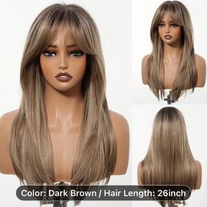 26-Inch Brown Curly Wave Long Wig with Bangs for Women - Elegant Rose Net Cap, Natural Look for Parties, Dinners & Casual Attire, Fit All Ethnicities, Versatile Hairpiece, Stylish Hairpiece, Secure Fit, Wavy Hairpiece.
