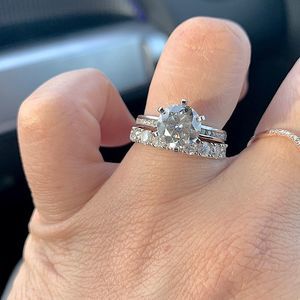 This stunning ring features a 2 carat round brilliant cut center moissanite E in color and VVS1 in clarity. It features a Excellent cut, polish, and symmetry. There is a very very slight carbon crystal inclusion at the table that gives it the VVS1 grade. It is an otherwise very clean stone with a beautiful sparkle. The ring is accented with 19 round cut lab grown moissanite that add .60 carats. The total stone weight in the ring all together is 2.62 carats. The ring is crafted of 14k white gold and currently a size 6. We offer complimentary resizing to fit.
