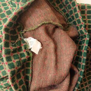 These authentic vintage wide-leg pants showcase an intricate checkered pattern in green, beige, and red tones. The fabric's texture and style reflect a bygone era, offering a unique flair to any wardrobe. These pants capture the essence of retro fashion, adorned with a classic fit that speaks to timeless elegance.