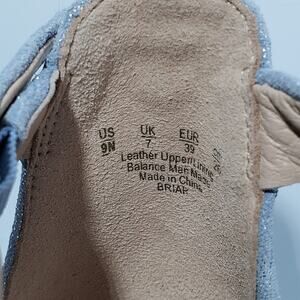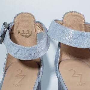Gorgeous baby blue metallic suede Briar block heels from 27 Edit by Naturalizer. Ankle strap buckles. There are 2 marks on the straps and a rubbed spot on the heel as shown in the photos. 4" heel that includes the 1" platform