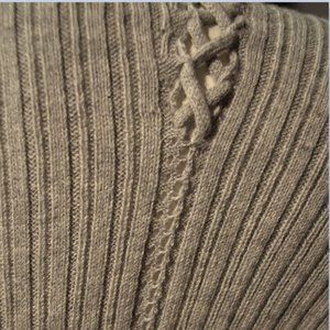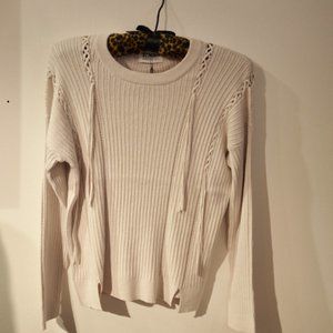 27 MILES light heather grey, or chalk-y blush soft & pure cotton rib w X-CROSS OPENWORK/FRINGEY & LATTICE detail CREW NECK SWEATER . Lovely, slim fit.