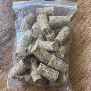 Item: 27 pack of tapered cork bottle stoppers suitable for sealing small bottles, jars, and various craft projects.
