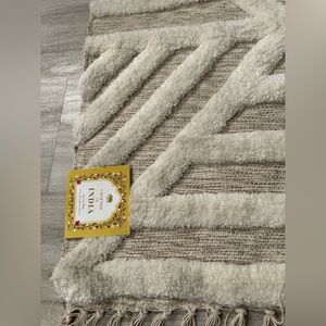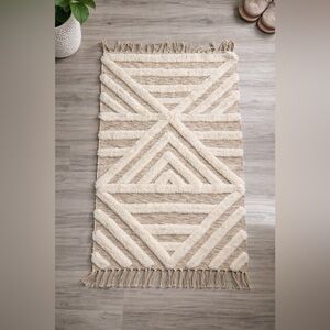 Beautiful handcrafted accent rug featuring a raised geometric pattern in soft cream over a natural beige base. Plush texture adds depth and warmth, making it perfect for entryways, bathrooms, bedrooms, or layered decor. Finished with knotted fringe on both ends for a cozy boho vibe.