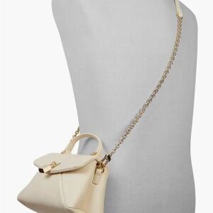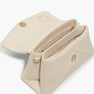 This Ted Baker mini satchel in a sophisticated cream hue features a structured design with a gold-tone clasp, offering a polished and professional look. Its minimalist aesthetic and size make it a versatile choice for daily use, effortlessly complementing any outfit. 100% leather NWOT