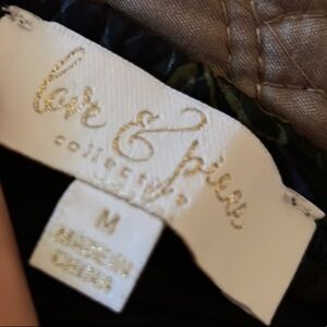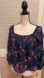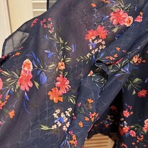 Navy background with floral design in red and pink and tan. There is a hint of an animal print in the navy. Very subtle
