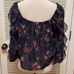 Bishop sleeves. End in elastic at the cuff. Are sheer. Have delicate ruffle details running down them.