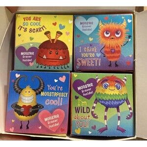 The product is a set of 28 Valentine's Day cards for kids from Peaceable Kingdom, featuring monster erasers. Each card comes as a mini box that contains a monster eraser, perfect for gifting to classmates or friends. The cards have a colorful eye catching theme and are designed with cute monster illustrations, with a spot on the back of the box to put your friends name and your childs name. It is suitable for children ages 4+ who may be having a Valentine's Day celebration. The boxes measure 2 inches in height 2 inches long and 0.5 inches in width, making them a fun and unique choice for spreading love and friendship during the holiday season.