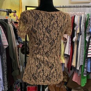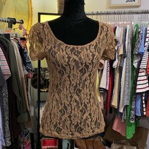 #28 Vintage Y2K Forever 21 Ruched Sleeve Tan Lace Knit Layering Shell Blouse Shirt Top Medium