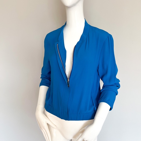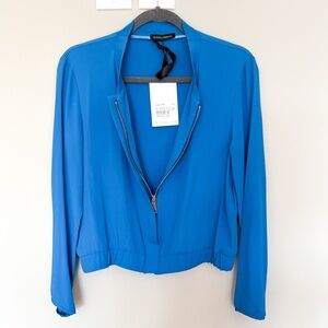 Office, business casual, wear to work, party, going out, bright blue, neon blue, turquoise, luxury brand, high end, wardrobe staple, brunch, girls night, date night, light jacket, summer, sprint, vacation, resort wear, easy to style, high end, unique, statement top