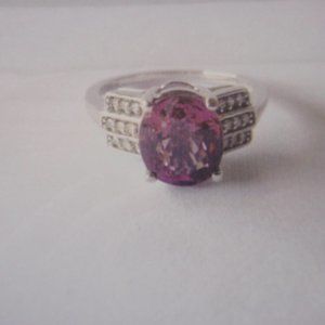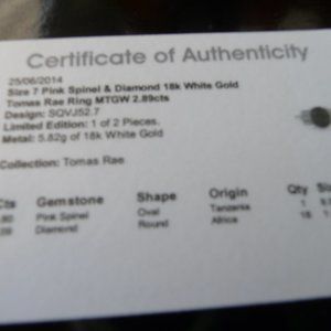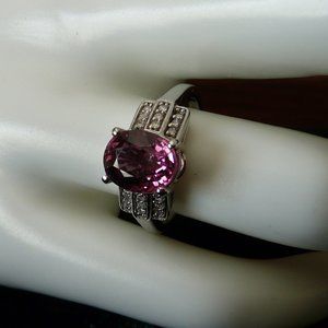 Super alternative to a traditional engagement ring. The appraiser said "violet rose", that's Pink to us mortals. This gorgeous 2.80 ct oval Spinel (MI) is from Tanzania. Flanked by 18 tiny bead seat diamonds (H/J, VS1/I1), set in 5.82 gms of 18K white gold. Currently size 7, jeweler should be able to resize. Certificate of authenticity and copy of independent appraisal accompany purchase. From my collection, it is unworn. Make me an offer, and ask as many questions as make you comfortable.