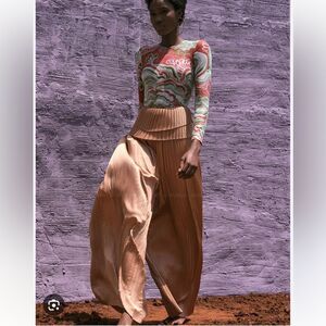 The high-waisted LINEA pants with back invisible zipper are those statement pants you can repeatedly count on. Designed with Andrea Iyamah's signature pleated fabric, these pants feature a flattering 2- layer peplum and a comfortable wide leg. This piece mesmerizingly moves with you with each step as you float about your day. Model is 5'7" and is wearing a size XS. Care Instructions: Hand wash cold + Line Dry