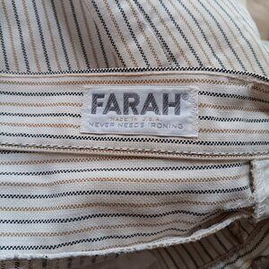 These striped Farah shorts embody a timeless vintage charm with their high-waisted fit, frayed hems, and retro button detail. Their pre-loved aesthetic tells a story of enduring style and character.