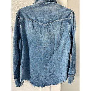 100% cotton. Made in Mexico. Machine wash. Snap button front closures. Breast flap pockets with snap button closures. Barrel cuffs with snap button closures. Frayed hem. Manufacturer Style No. 158-1WCWS.