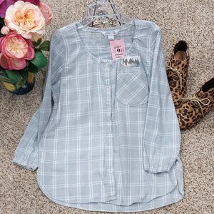 2901 Size Medium Old Navy Grey and Blue Upcycled Button Down Shirt. Pit to pit 21" length 26" sleeve 20".