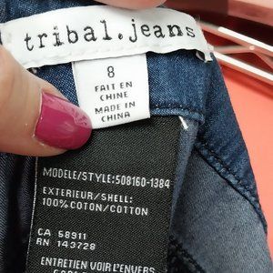 2920 Size 8 Tribal Loose Fitting Appliqued Upcycled Jeans. Waist 16" inseam 35" rise 10".