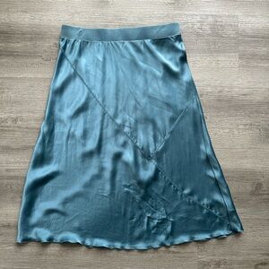 This elegant teal silk skirt features a sleek design with subtle seam details. Perfect for any occasion.