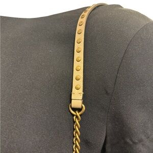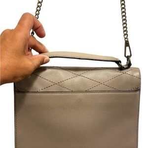 This elegant tan REBECCA MINKOFF JE T'AIME MEDIUM QUILTED LEATHER CROSSBODY quilted shoulder bag is perfect for any occasion. Featuring a stylish design with a gold chain strap, it adds a touch of sophistication to your outfit.in great conditions. Original price is $295